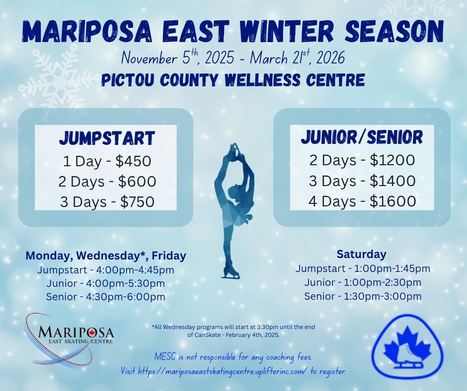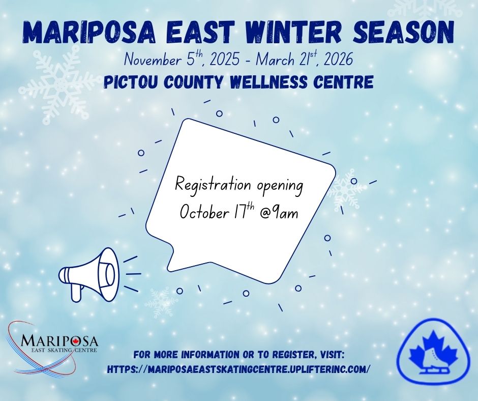 Located in New Glasgow, Nova Scotia, Mariposa East Skating Centre is a nonprofit organization, sanctioned by Skate Canada/Skate Nova Scotia and dedicated to the sport of skating. We strive to provide the best programming possible for our skaters; whether it be for hockey, figure skating or just for fun!